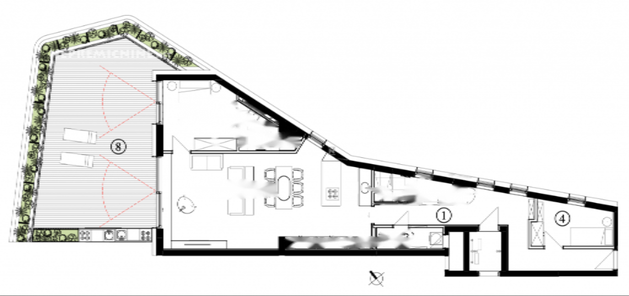 В апартаменте просторная планировка: холл, две спальни (одна из них с личной ванной), вторая ванная комната, техническое помещение, а также объединённая зона кухни, столовой и гостиной. Спальни направлены на северо-восток, а терраса и жилое пространство выходят на северо-запад. Большие стеклянные двери позволяют выйти прямо на террасу, гармонично соединяя внутренний и внешний мир.
