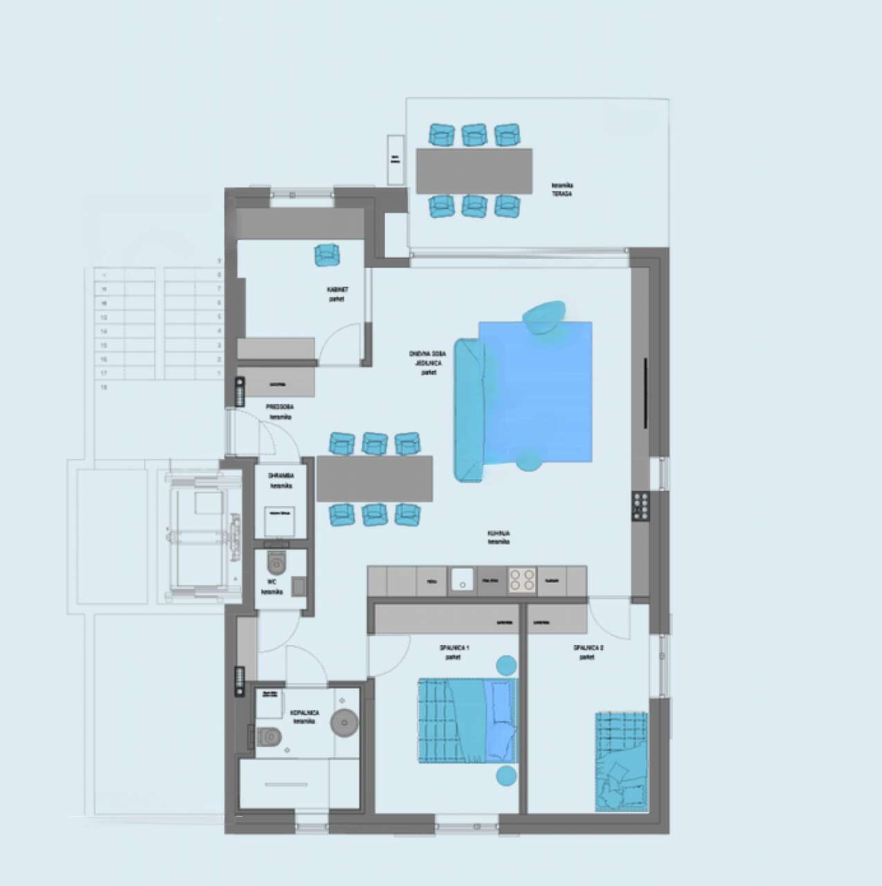 Просторная квартира располагается на уровне первого этажа в четырехуровневом здании и имеет общую площадь в 187,3 м². Современное строительство и эргономичная планировка делают это жилье подходящим для комфортной жизни. В квартире три спальни, одна ванная комната, стильная кухня и уютная гостиная, наполненная светом. Атриум, ориентированный на восток, площадью 58 м² и терраса на 16 м² позволят насладиться солнечными днями и свежим воздухом. К квартире дополнительно предоставляются кладовая и подвал.