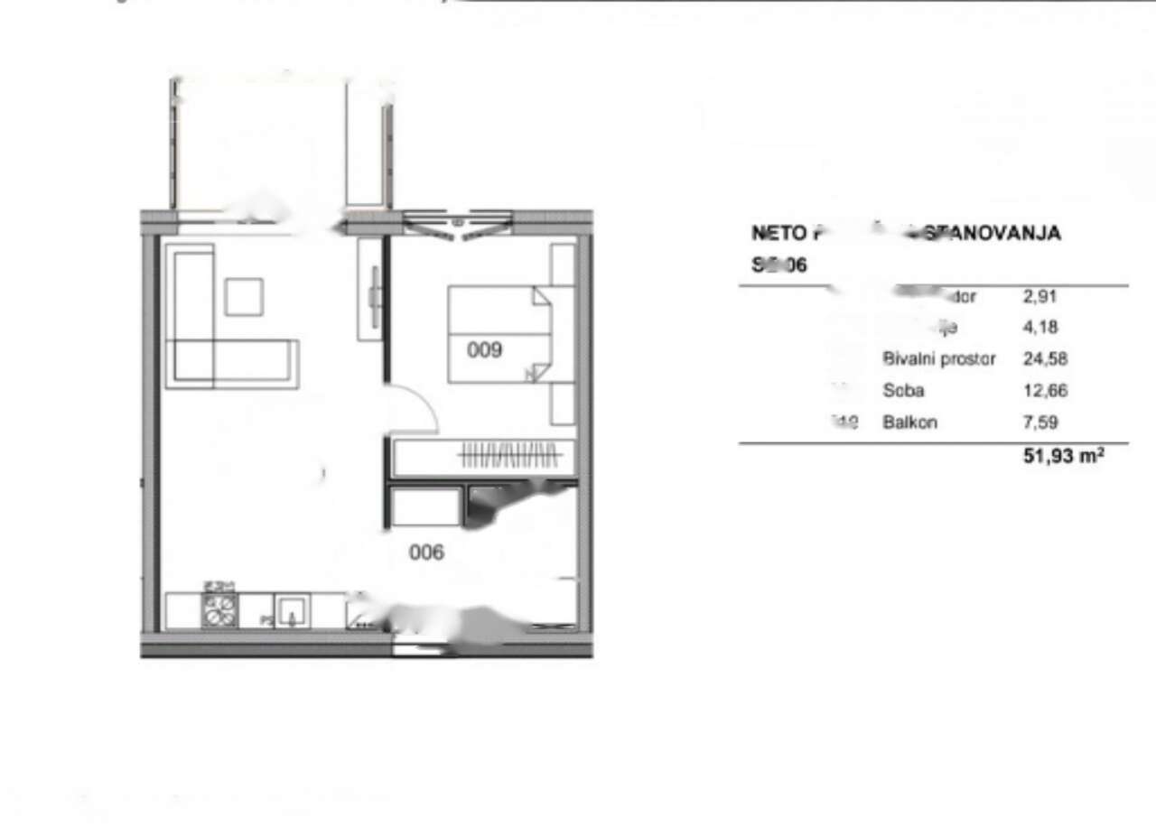 Планировка включает в себя прихожую, ванную комнату, объединённое пространство кухни и столовой, спальню и просторный балкон. Квартира частично укомплектована мебелью: встроенная кухня с бытовой техникой, кровать, мебель в ванной, обеденная группа и тумба под телевизор. Комплекс также предлагает помещение для хранения велосипедов.