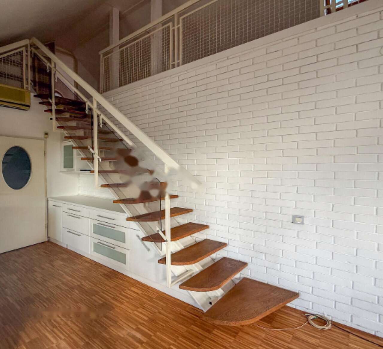 На нижнем уровне квартиры расположены просторная гостиная, совмещенная с зоной для обедов, кухня, застекленная лоджия, большая спальня, отдельная ванная комната, туалет, кладовая и прихожая. На верхнем этаже находятся просторная спальня (ранее разделенная на два помещения) и галерея.