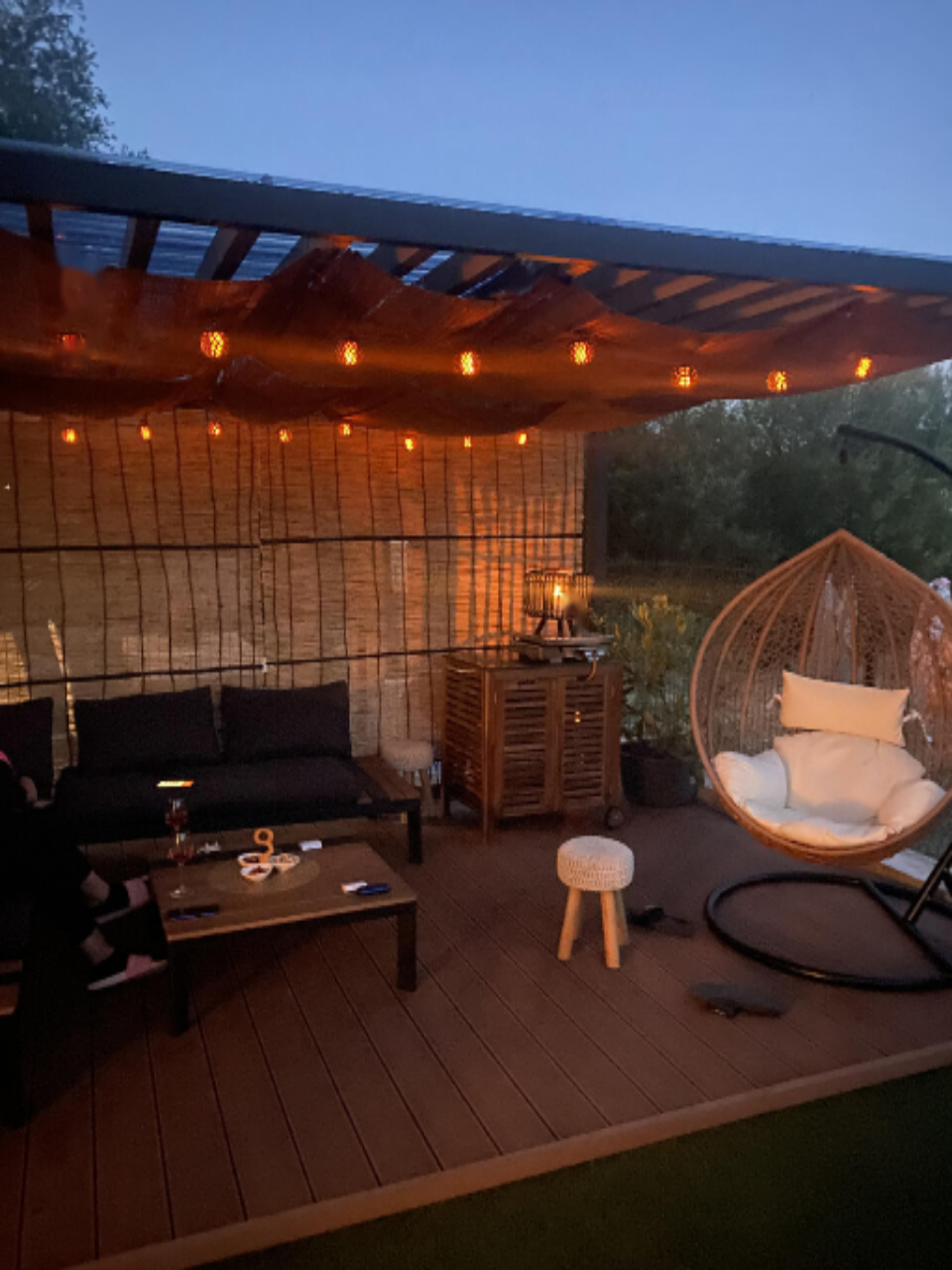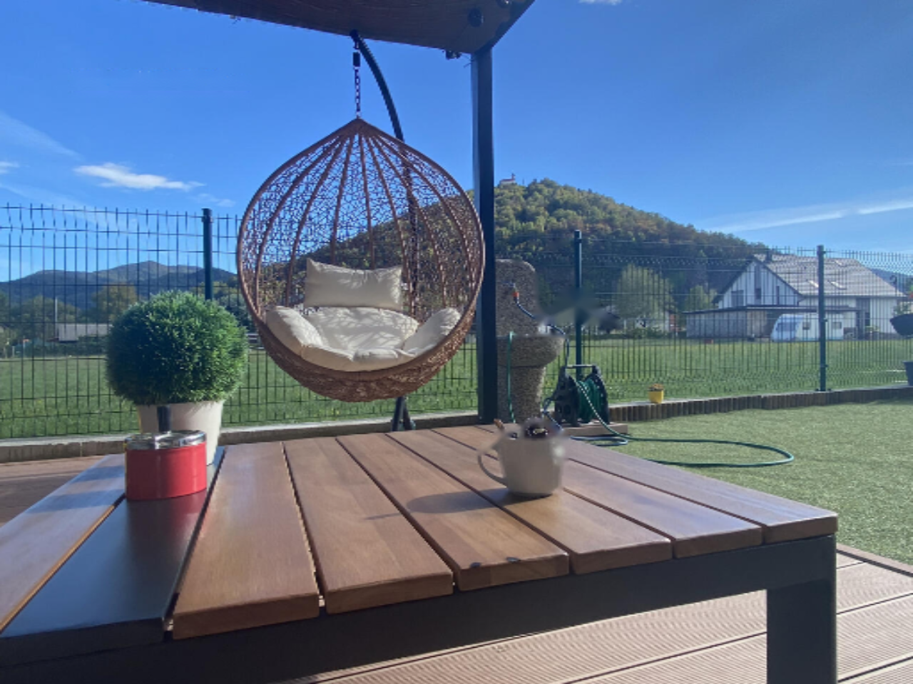 Участок содержит гараж для одного авто, три парковочных места перед домом и отдельную площадку для гостей. Также на территории стоит подсобное помещение для хранения садового инвентаря и игрушек. Гостиная открывает доступ на уютную террасу и зеленую лужайку.