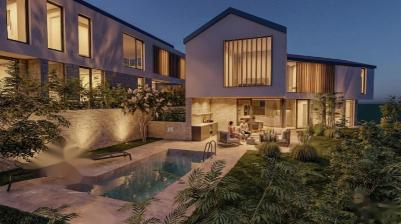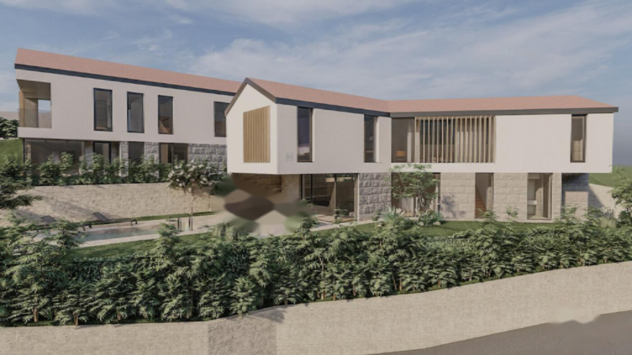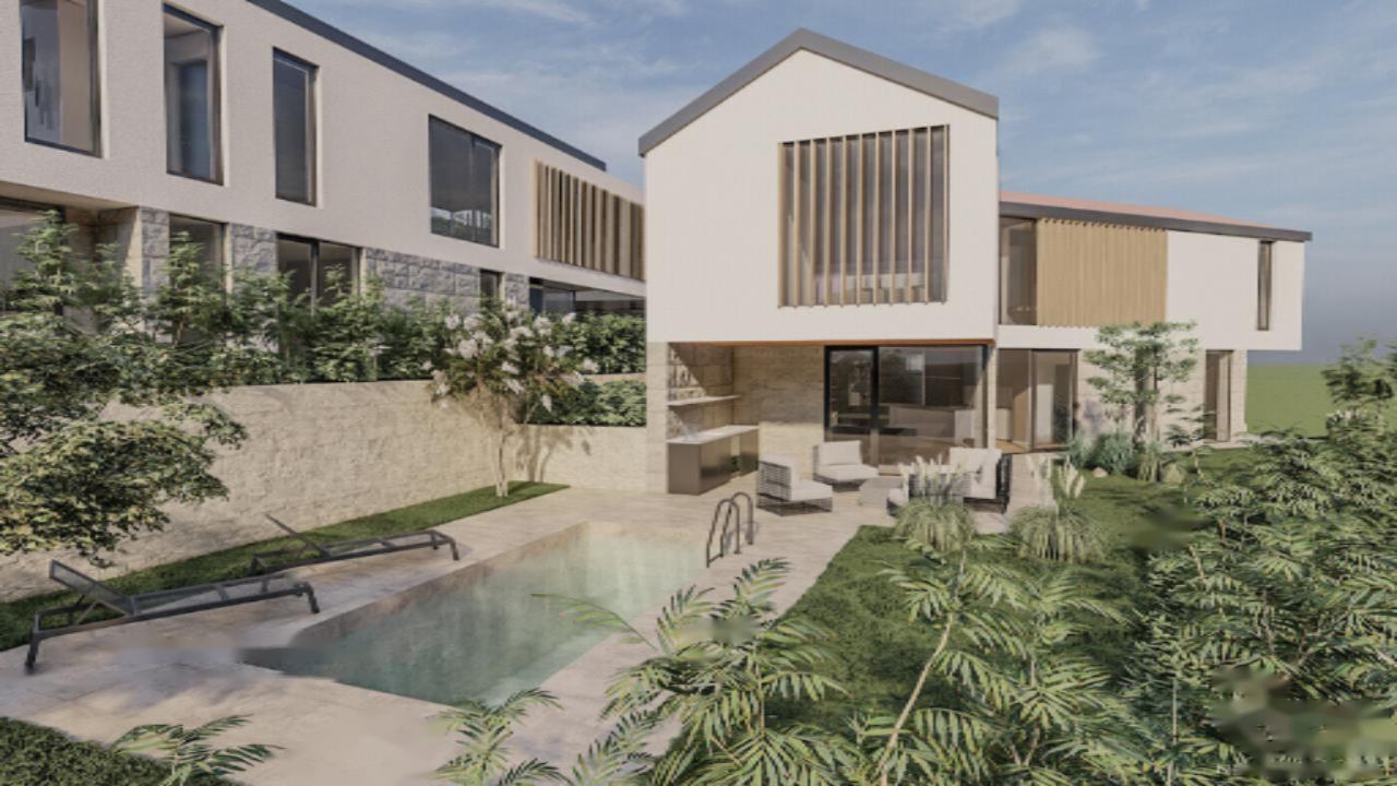 Экстерьер здания выделяется белым фасадом с деревянными вставками и элементами из местного камня, создающими теплый антураж. Двускатная крыша с легким уклоном придает вилле особую привлекательность. Из дополнительных удобств: гараж на две машины и частный бассейн площадью 18 м².