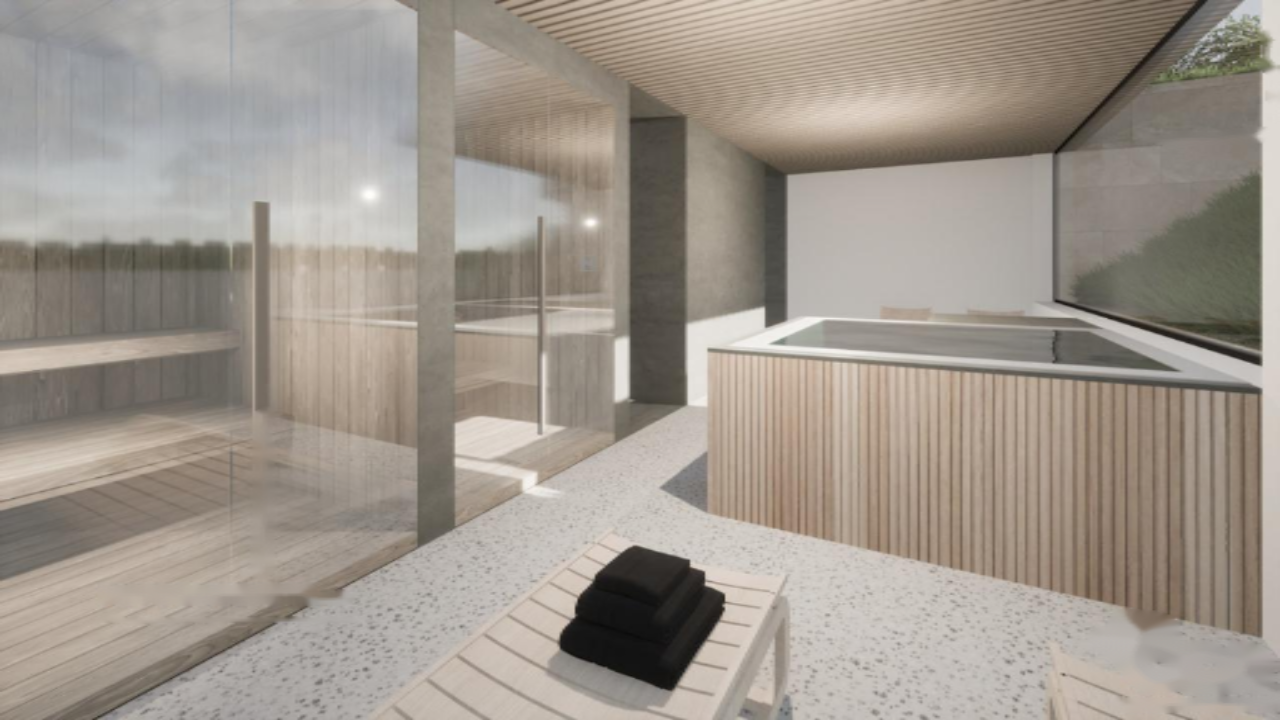 В цокольной части находятся спа-зона с турецкой и финской саунами, джакузи, комната для релаксации, санузел и техническое помещение. Первый этаж располагает прихожей, отдельным санузлом, просторной гостиной с выходом на крытую террасу, кухней и обеденной зоной. Также здесь расположены кладовая и лестничный марш на второй этаж. Второй этаж включает три спальни (две с личными ванными комнатами), дополнительное помещение, кабинет и еще одну ванную комнату.