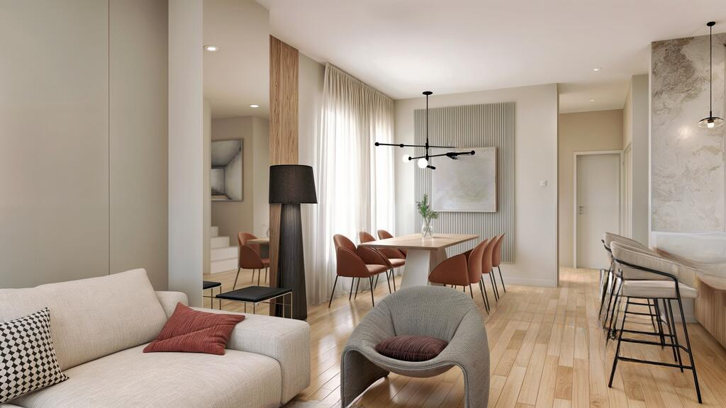 На продажу выставлен современный дом с террасой, находящийся в районе Поле, восточная часть Любляны. Это новостройка в тихом, благоустроенном месте, состоящая из двух уровней: первый и второй этажи. Здание завершено на четвёртой фазе строительства, сохраняя высокие строительные стандарты. Уже проведены основные работы по электрике и сантехнике. Последние этапы включают в себя завершение фасадных работ с установкой ограждений на балконах и благоустройство окружающей территории.