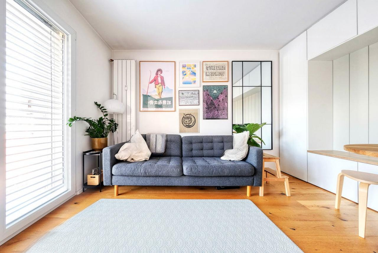 Квартира расположена на последнем этаже и обустроена с тщательным вниманием к мелочам. При входе справа располагается просторная и светлая гостиная, тогда как слева находится спальня с вместительными шкафами. Между ними — удобная ванная комната. С запада оба помещения соединяет стильно оформленная кухня.