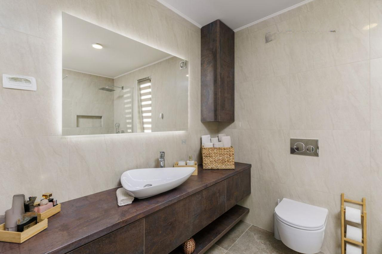 Интегрированное оборудование является воплощением высокого качества: трехслойные стеклопакеты от ALUKS, автоматические жалюзи и антрацитовая фурнитура. В холле расположено панорамное окно с электрическим рулоном, который позволяет частично затемнить помещение. Внутренний дизайн дома выполнен из специально подбираемых материалов: керамическая плитка Evolution на первом этаже и паркет в спальных зонах. В ванной комнате используются признанные бренды Hansgrohe и Villeroy & Boch. Вся встроенная мебель изготовлена по индивидуальному заказу.