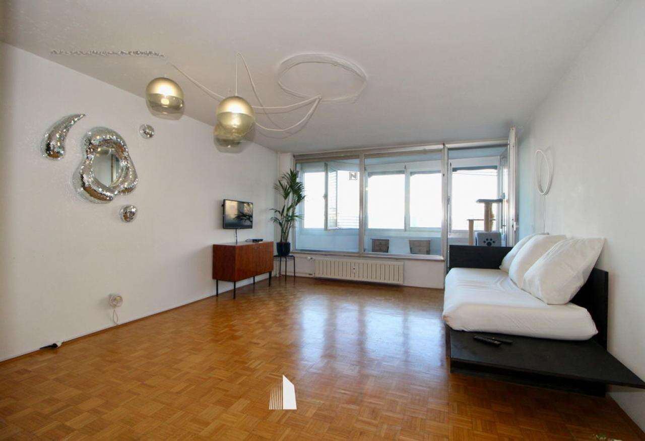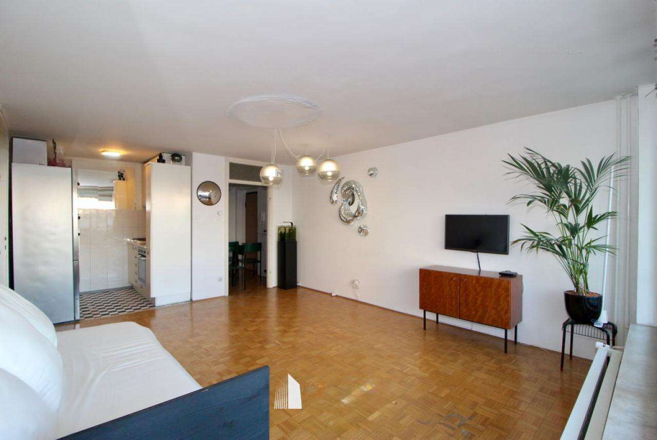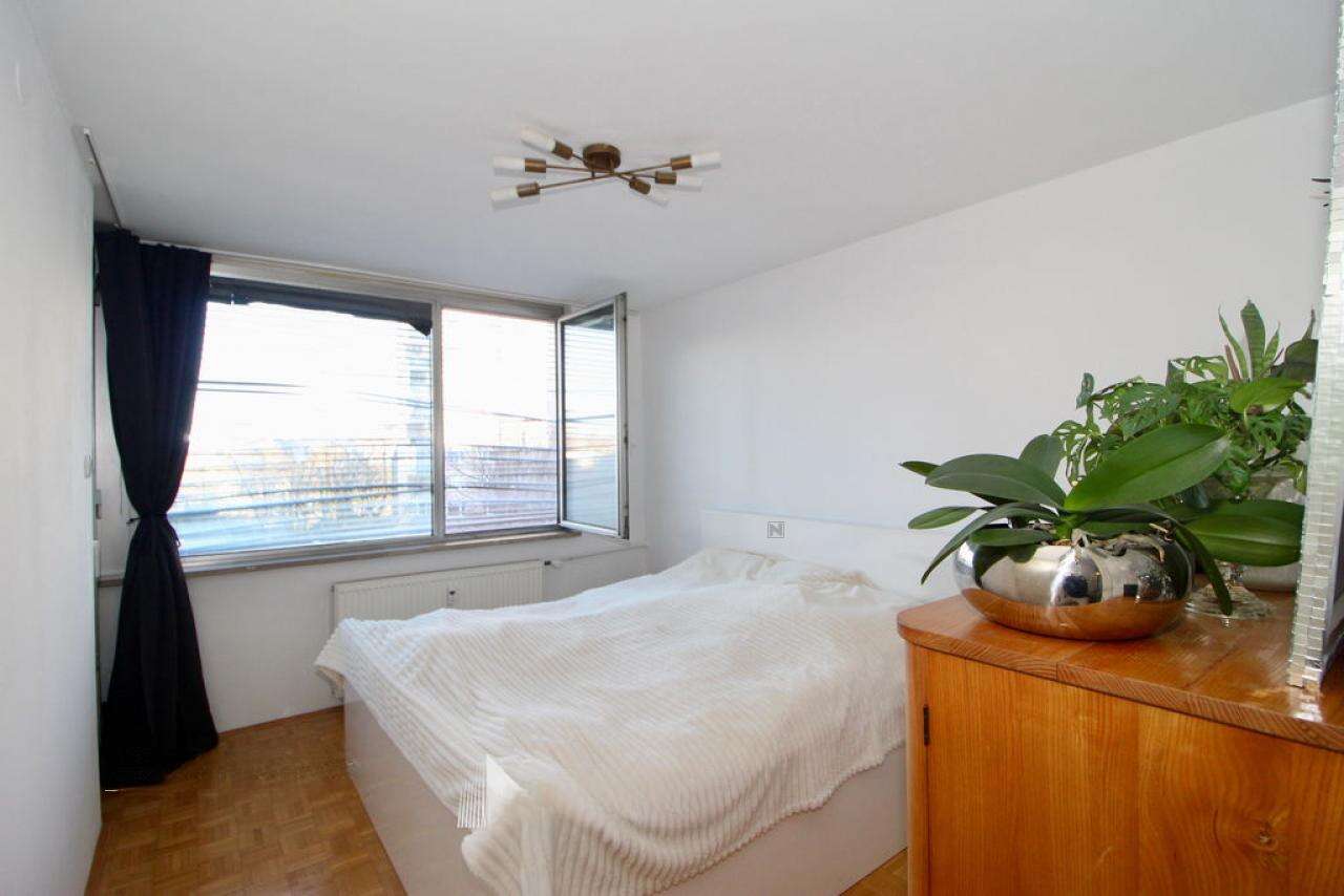 В продаже представлено уникальное, светлое двухкомнатное жилье площадью 58,5 м², расположенное на третьем этаже девятиэтажного дома в районе Бежиград, неподалеку от центра Любляны.
