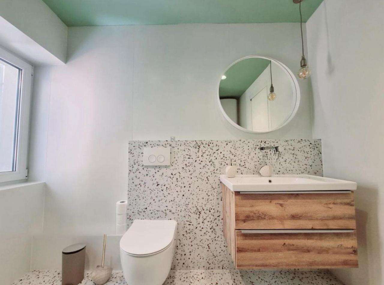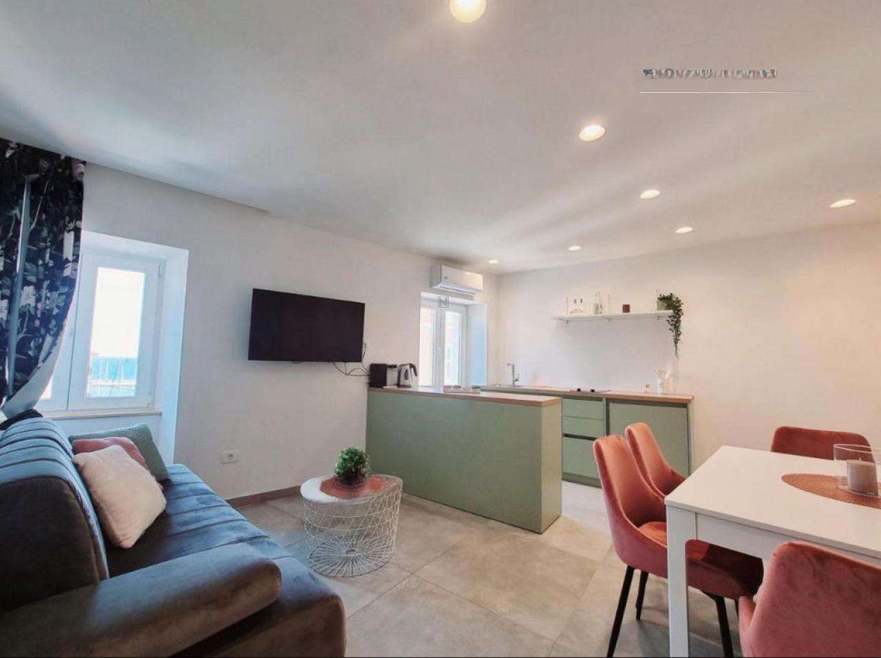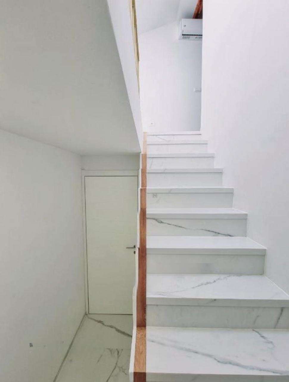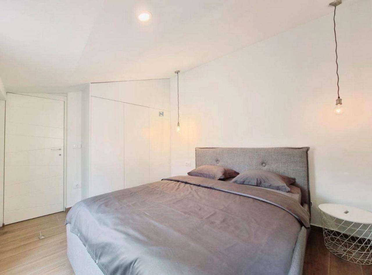 - На третьем этаже расположена первая квартира плoщадью 45 м², в которой просторная гостиная с кухней открывает восхитительный вид на Пиранскую гавань. Также здесь есть большая ванная и спальня с выходом на личную террасу.