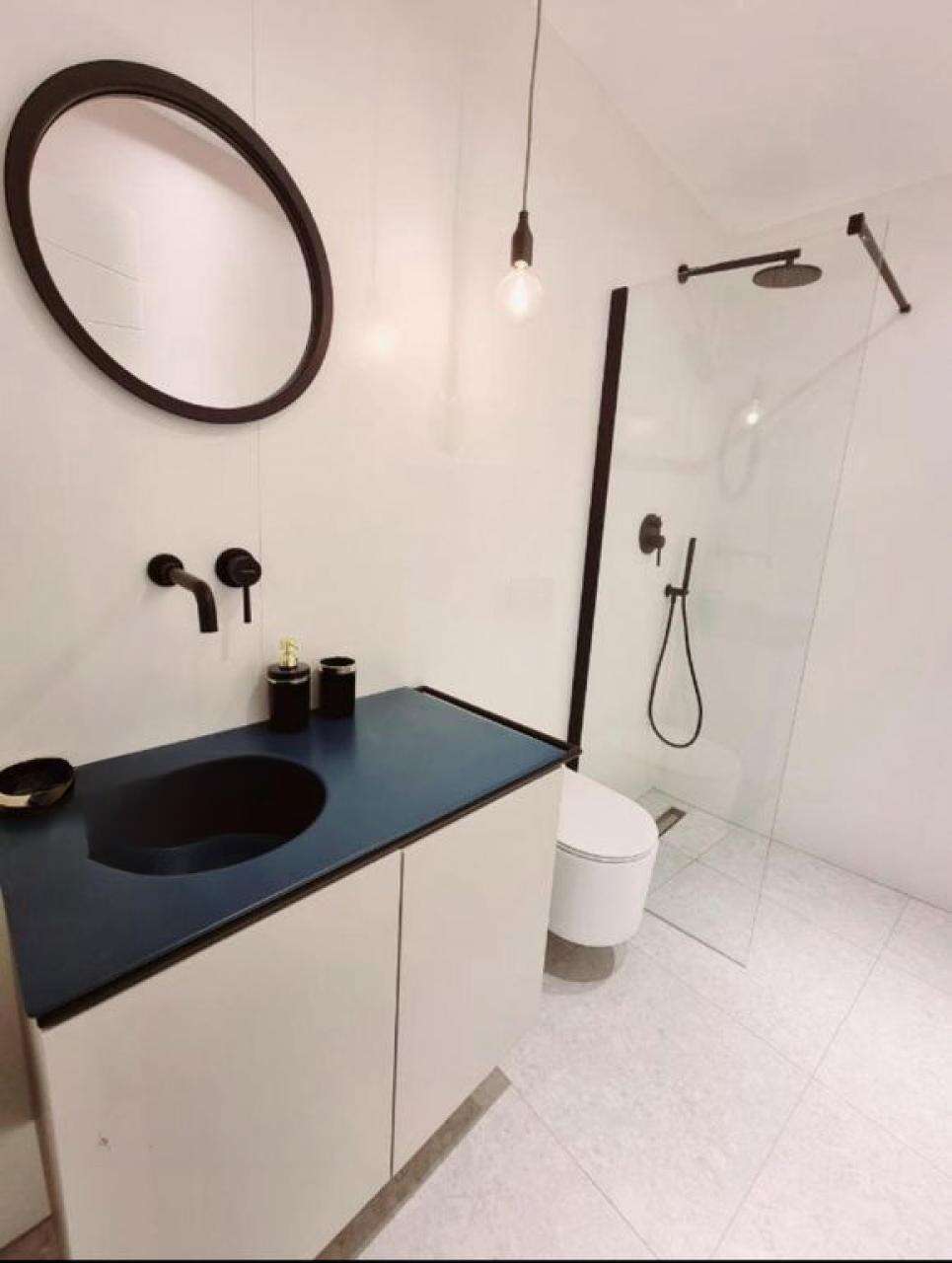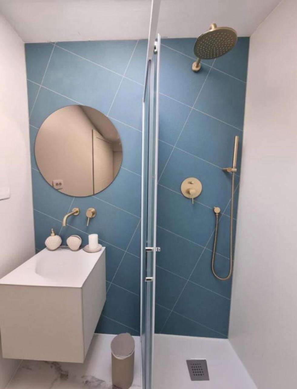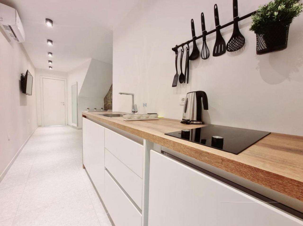 - Вторая квартира, тоже 45 м², находится на четвёртом этаже. Это светлое пространство с открытой планировкой гостиной и кухни, откуда видно море и гавань. В квартире предусмотрена просторная ванная и спальня с террасой.