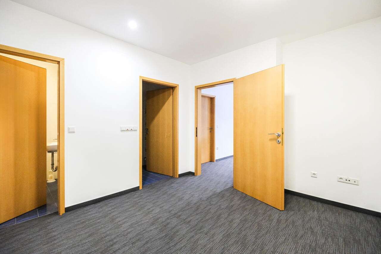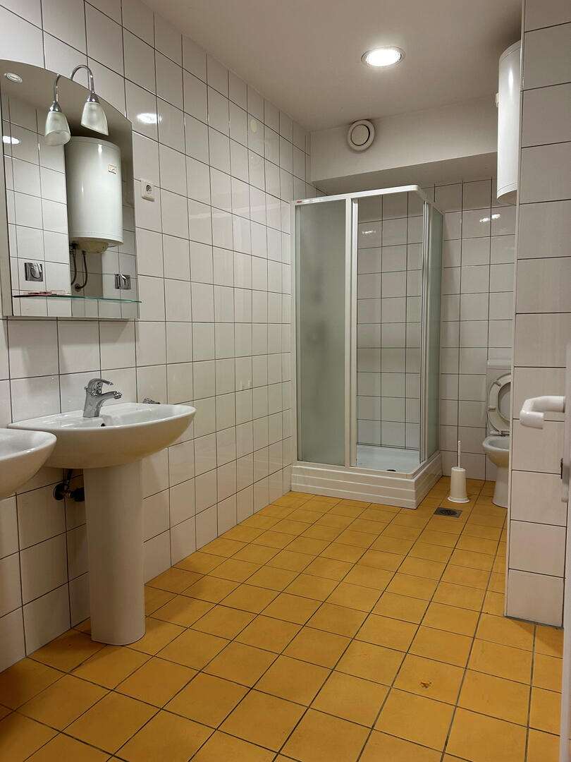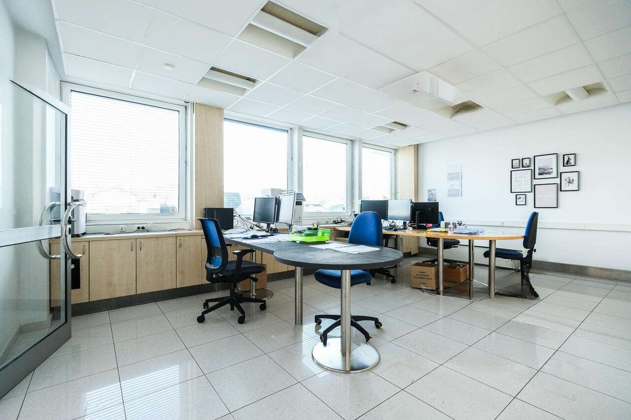 Предлагается к продаже многозадачное коммерческое помещение общей площадью 445 м², расположенное в районе Стегне. Здание было возведено в 1981 и модернизировано в 2011 году. Оно состоит из трех уровней: первый этаж отведен под офисные нужды, второй — для проживания, а цокольный этаж служит складом. Отдельные входы ведут в офис и жилую часть, а до подвала можно добраться по лестнице или с помощью грузовой платформы. Перед строением обустроена парковка на 8 мест, закрепленных за объектом.