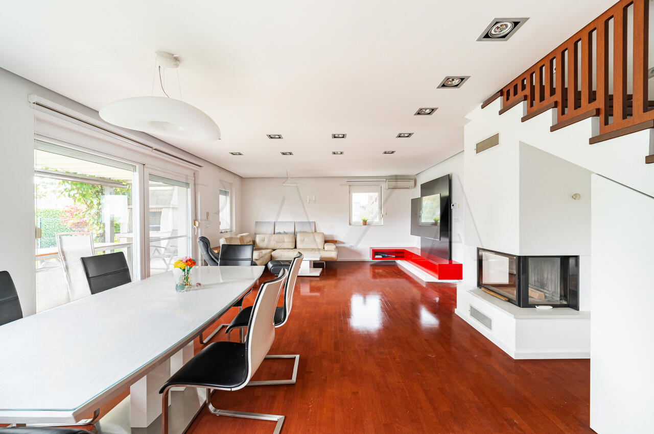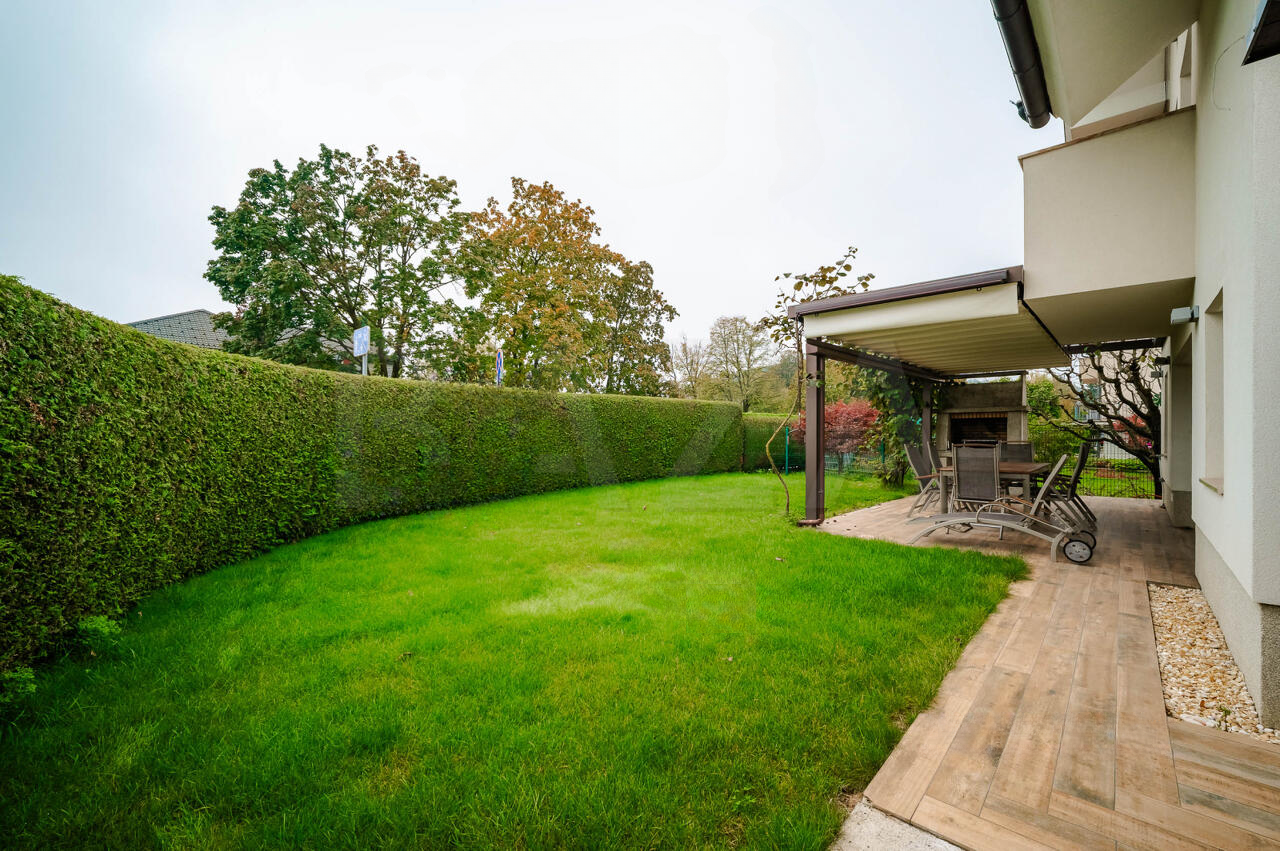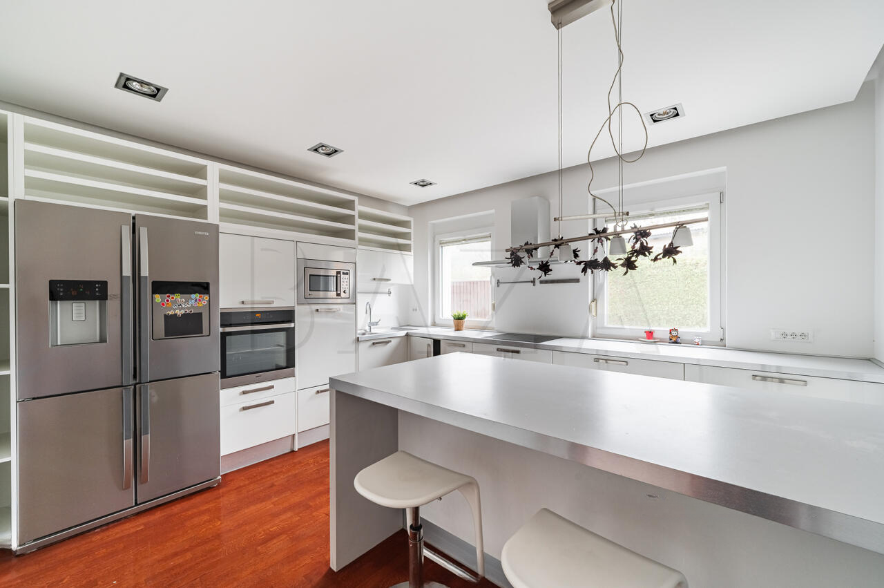 Дом полностью меблирован, находится в отличном состоянии, благодаря регулярному уходу: в 2025 году обновлены фасад и отшлифован паркет. Использованы высококачественные материалы с усовершенствованной тепловой изоляцией (18 см фасадной обкладки). Солнечная электростанция мощностью 10 кВт обеспечивает энергоэффективное и экологичное проживание.