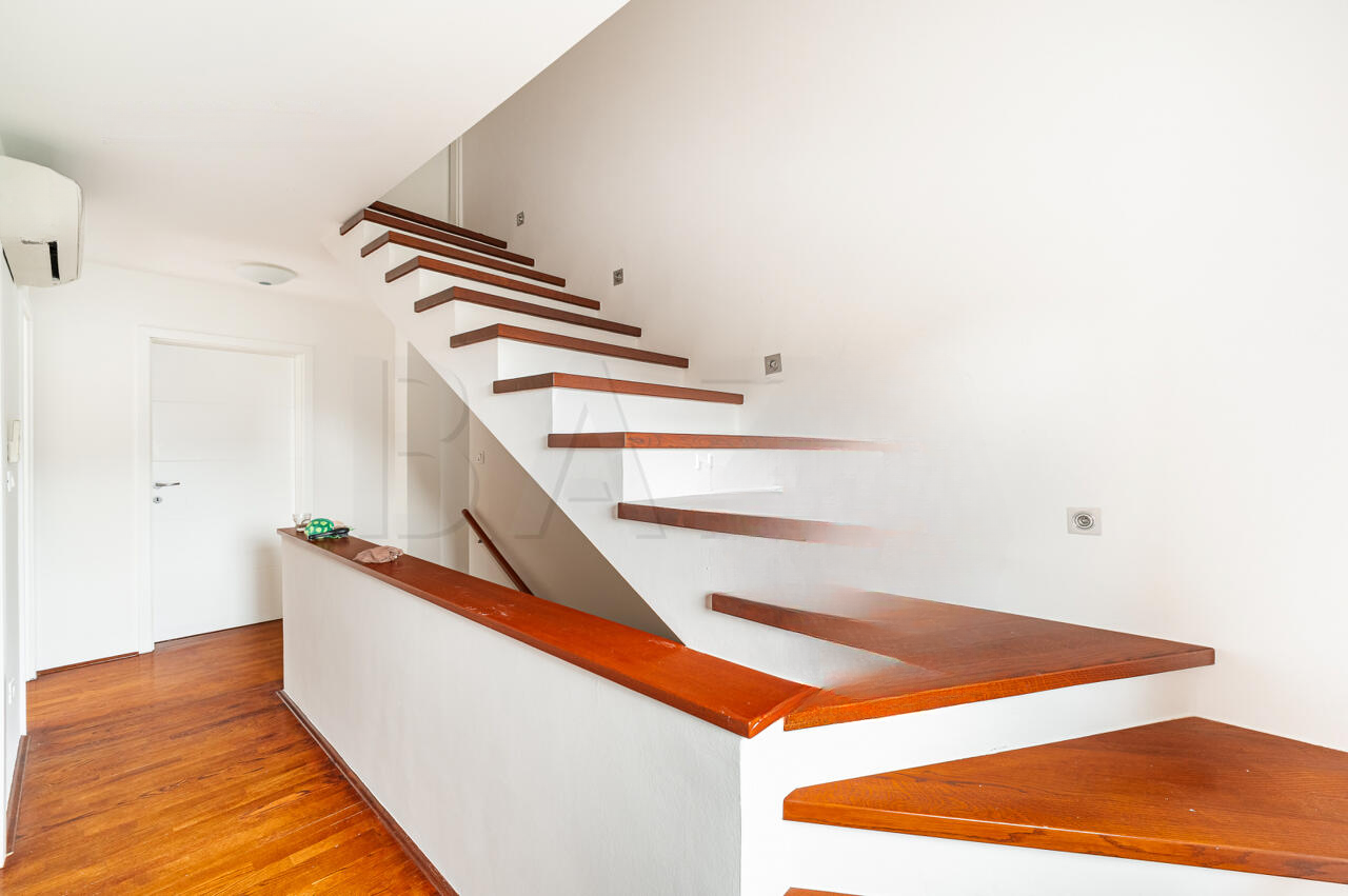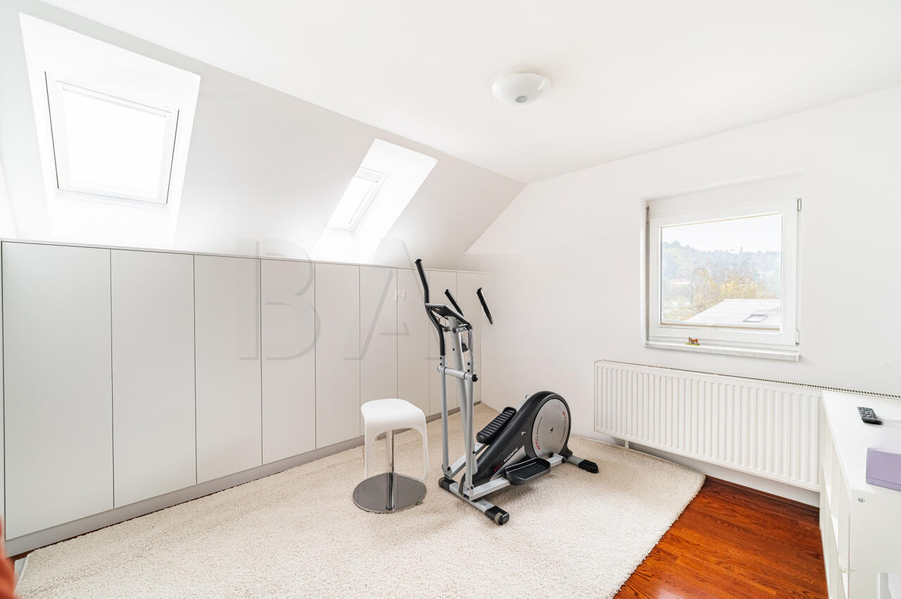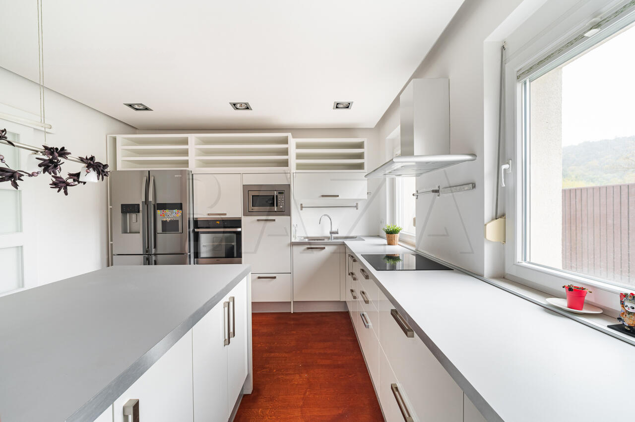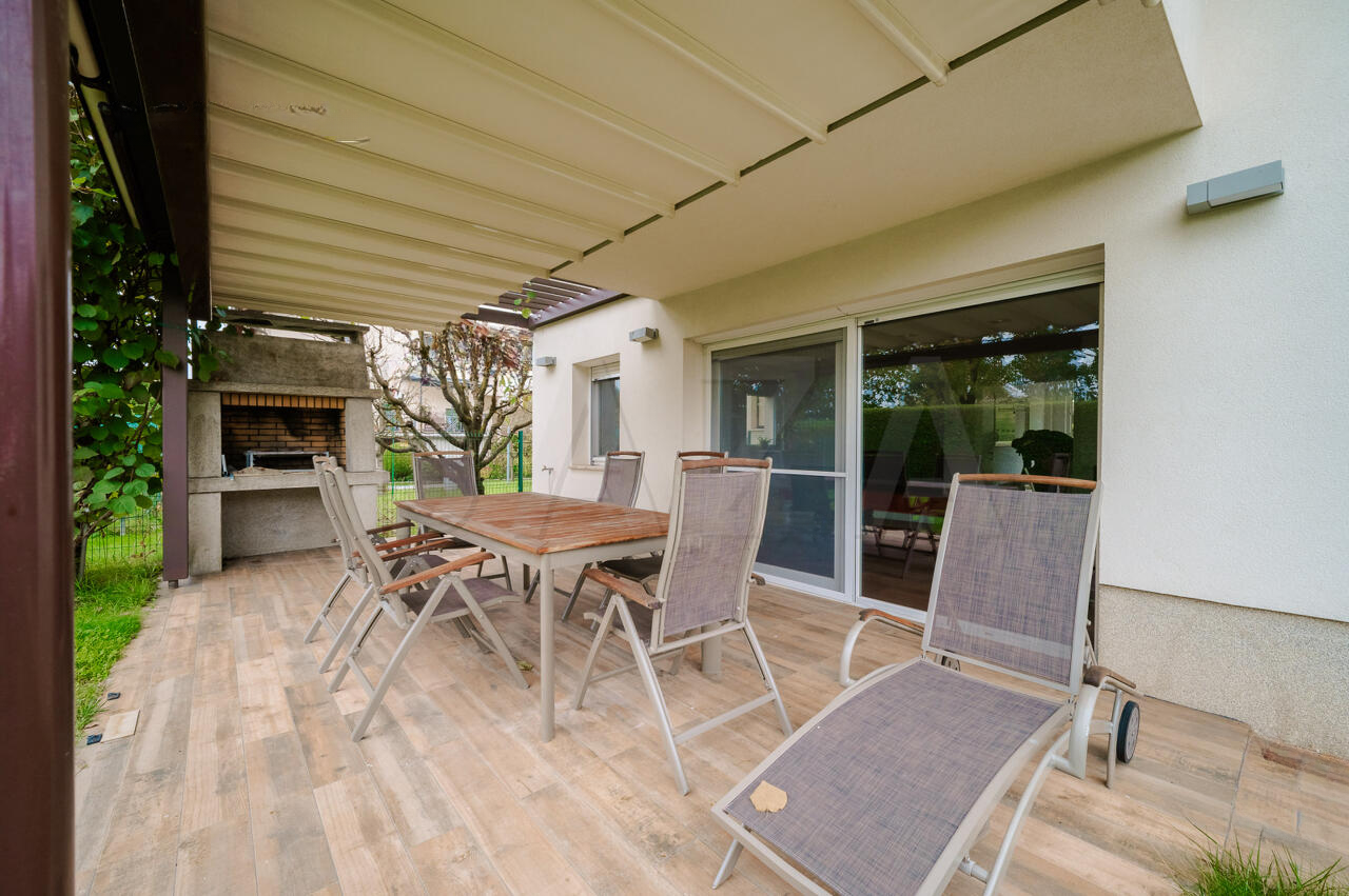 Дом полностью меблирован, находится в отличном состоянии, благодаря регулярному уходу: в 2025 году обновлены фасад и отшлифован паркет. Использованы высококачественные материалы с усовершенствованной тепловой изоляцией (18 см фасадной обкладки). Солнечная электростанция мощностью 10 кВт обеспечивает энергоэффективное и экологичное проживание.