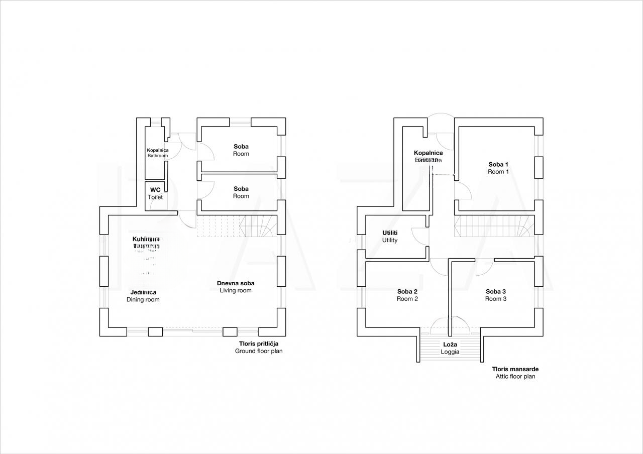 - Три уровня: первый, второй этажи и мансарда