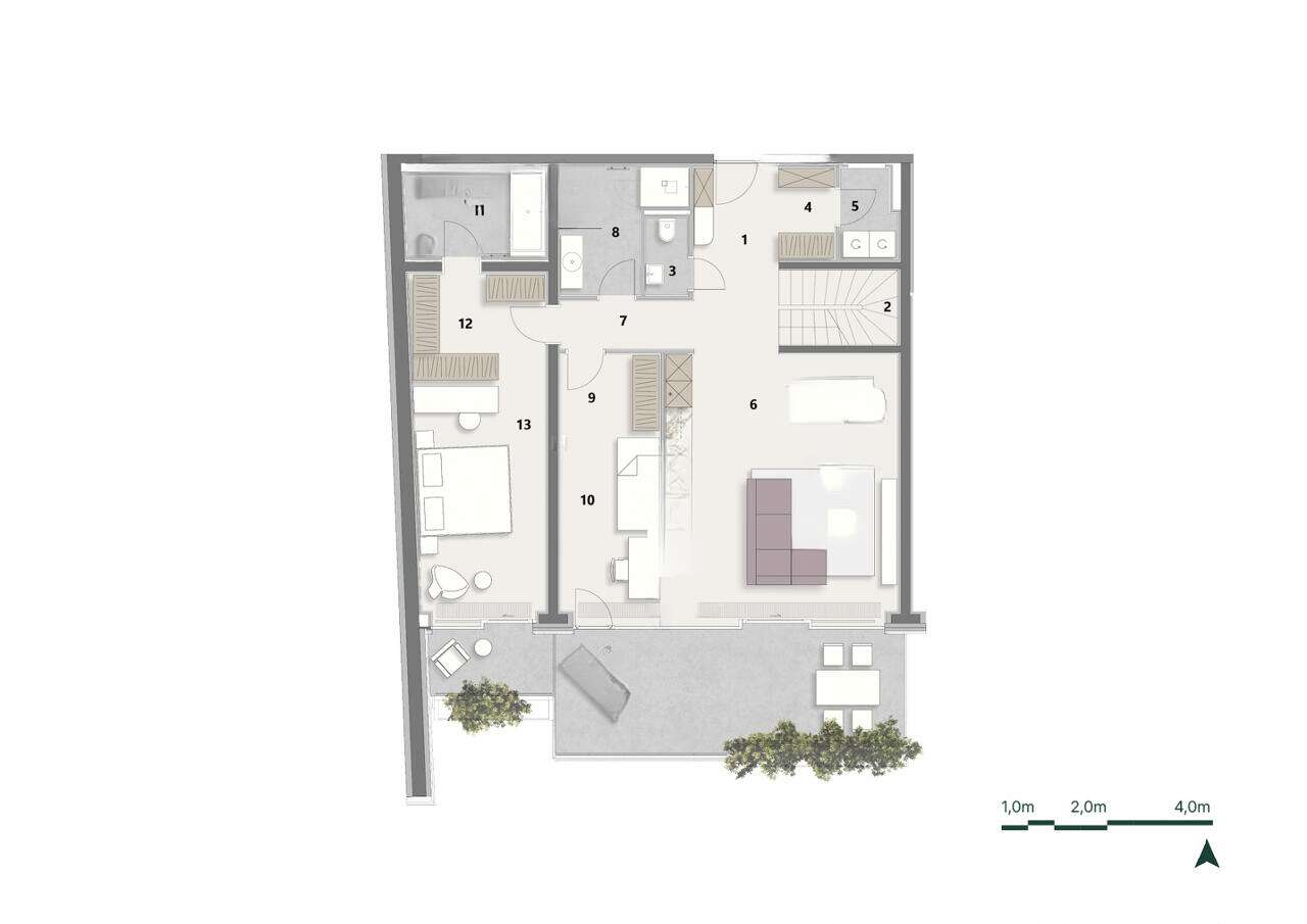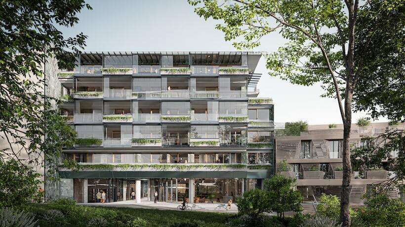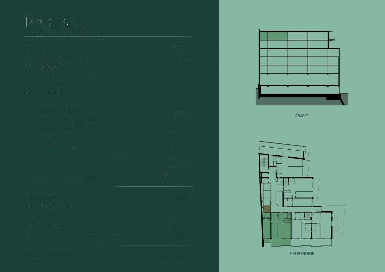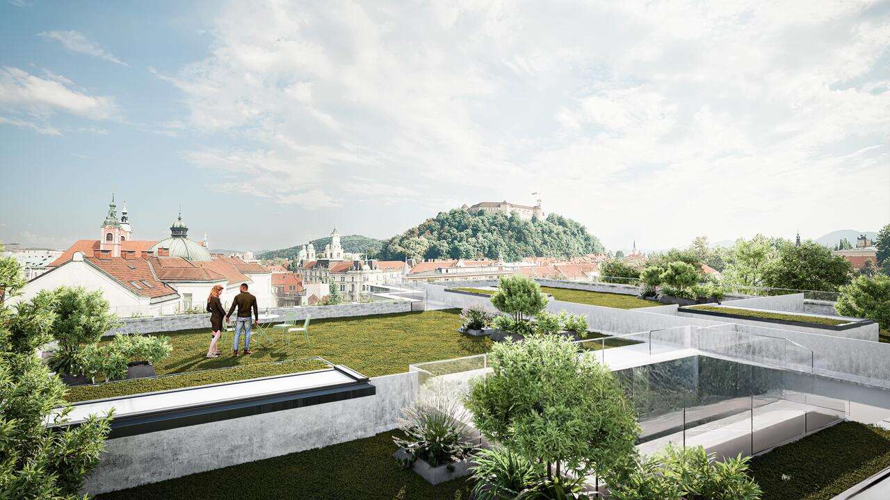 Жители верхнего этажа наслаждаются захватывающими панорамами Любляны и её окрестностей. Просторная южная терраса занимает 25,71 м², а личная зелёная крыша добавляет ещё 116,86 м² для вашего отдыха на свежем воздухе. Архитектура комплекса прекрасно сливается с окружающей природой, благодаря облицовке из натурального камня зелёного оттенка и обильной зелени, отражающейся в больших стеклянных окнах.