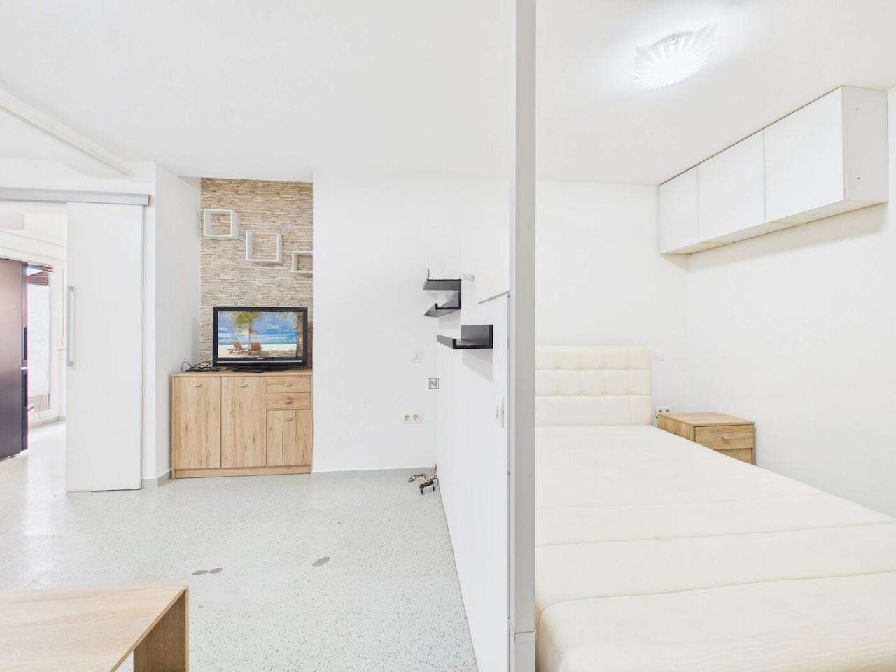 Планировка квартиры рациональна: имеется закрытая прихожая, центральное жилое пространство с зоной отдыха, отдельная кухня с выходом на террасу, ванная комната с душем и небольшая кладовая. Особенность интерьера — это кровать с подъемным механизмом, обеспечивающая дополнительные места для хранения. В 2014 году квартира прошла частичное обновление, она полностью оборудована и готова к проживанию.