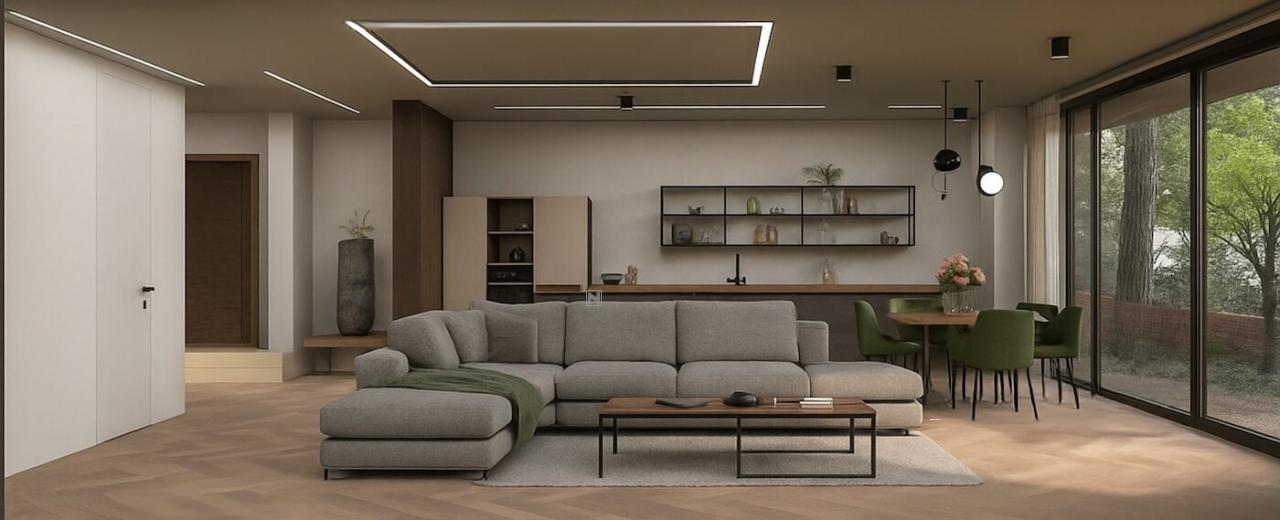 • широкая гостиная, плавно переходящая в кухню и столовую, с выходом в частную зелёную зону;