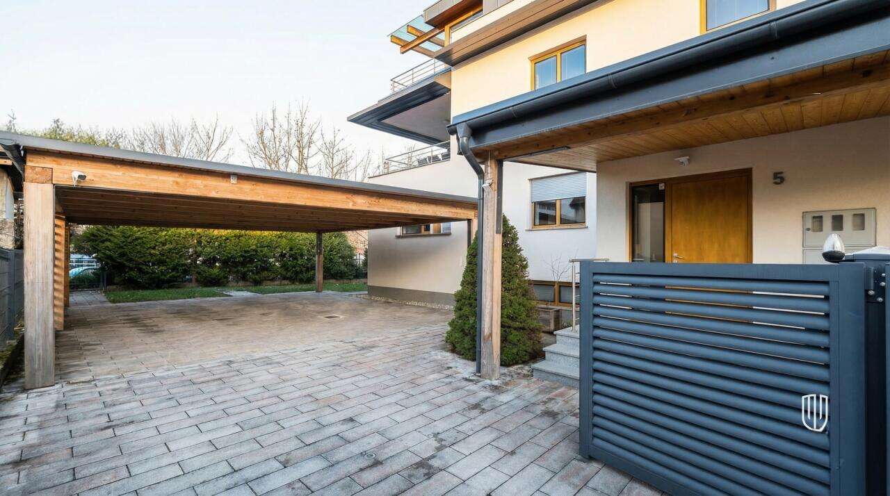 На участке имеется аккуратный огороженный сад с системой автоматического полива и роботом для стрижки травы, а также уютная летняя кухня. Перед зданием расположено крытое парковочное место на четыре автомобиля.