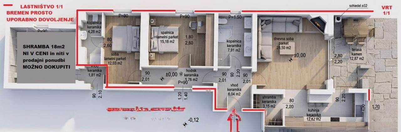 Предлагается к продаже просторная трёхкомнатная квартира в посёлке Бонини, расположенном недалеко от города Копер. Объект занимает площадь в 362 м², из которых жилое пространство составляет 78,4 м², включая две спальни и две ванные комнаты. Светлая гостиная и функциональная кухня с кладовкой имеют выход на террасу площадью 20 м² с летней кухней, что позволяет наслаждаться отдыхом на открытом воздухе.