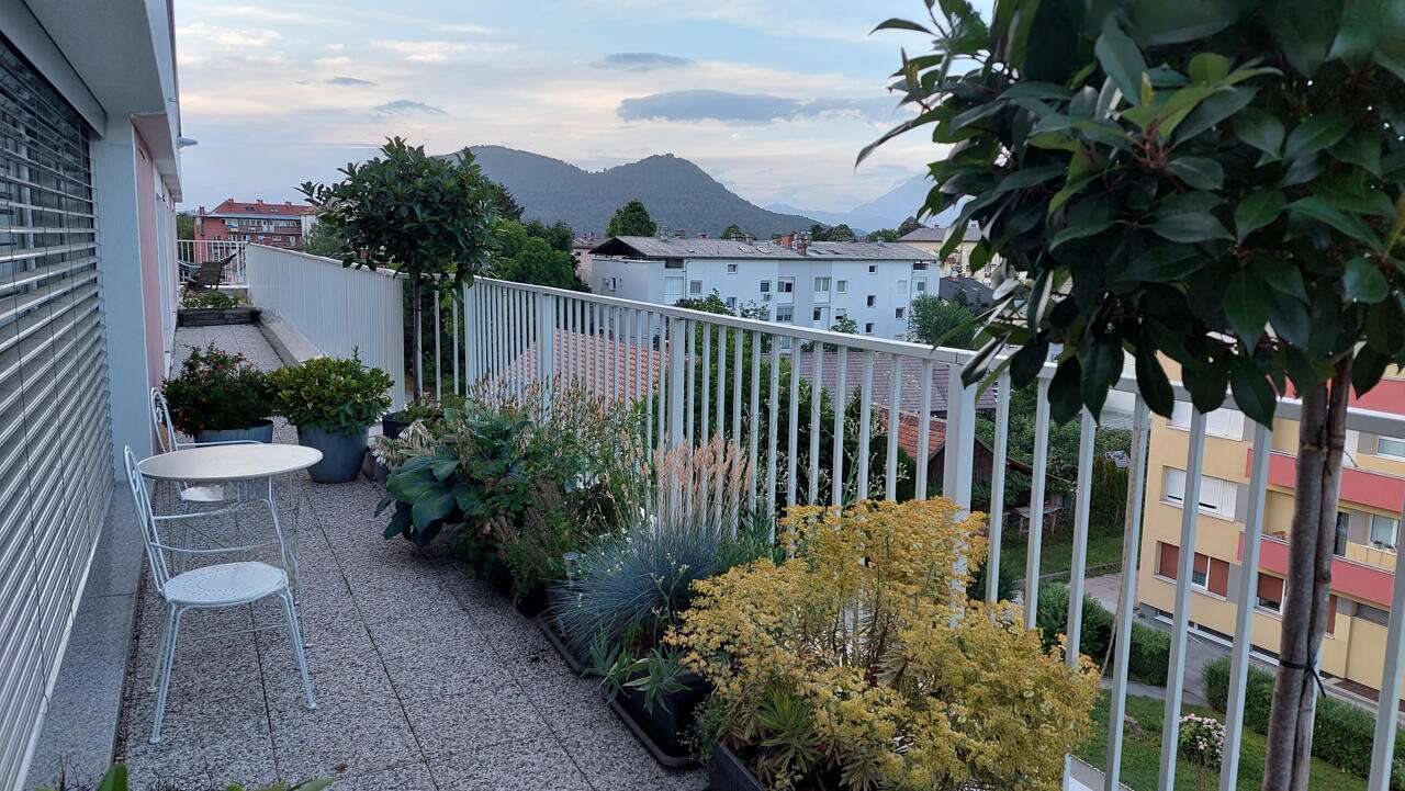Светлая и просторная квартира общей площадью 90 м² занимает последний, четвёртый этаж многоквартирного дома, который расположен в районе Шентвид, на окраине Любляны. Из окон открывается захватывающий вид на природные красоты — Шмарнскую Гору, Рашицу и Камнишские Альпы. Внутренняя планировка включает кухню, совмещённую зону гостиной и столовой, две спальни, кабинет, прихожую и ванную комнату. Стеклянная стена между гостиной и столовой ведет на террасу, даря панораму на протяжении всего дня.