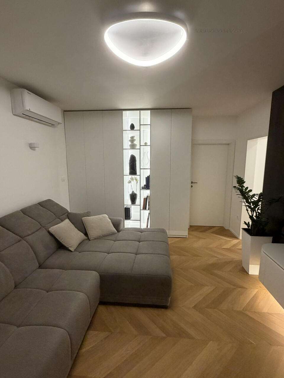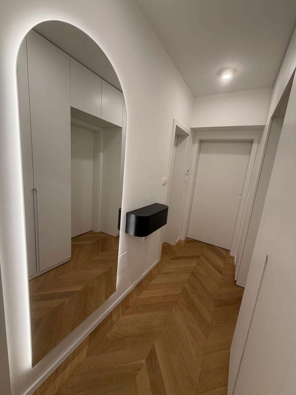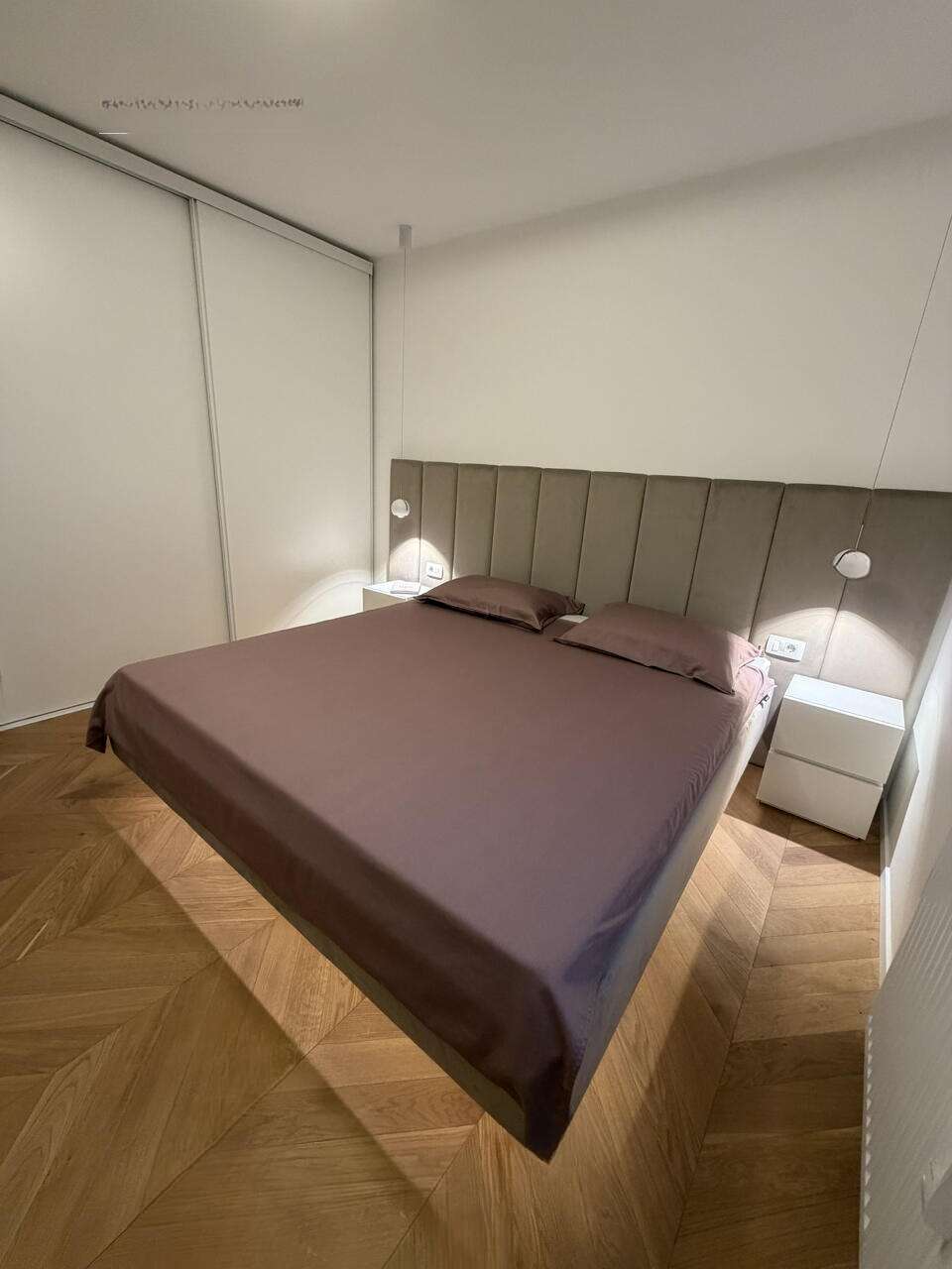 Кухня и гостиная обустроены с передовым оборудованием и высококлассной мебелью. В спальне установлена эффектная парящая двуспальная кровать, а также просторные гардеробы с LED-освещением. Детская комната может служить и кабинетом. В отделке использован масляный дубовый паркет в стиле «французская елочка» и итальянская керамическая плитка. Ванная комната отличается функциональностью и включает душевую и туалет.