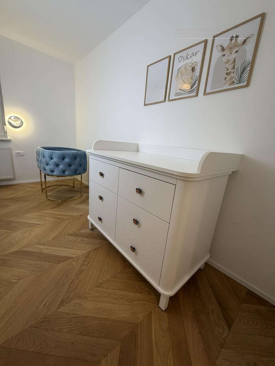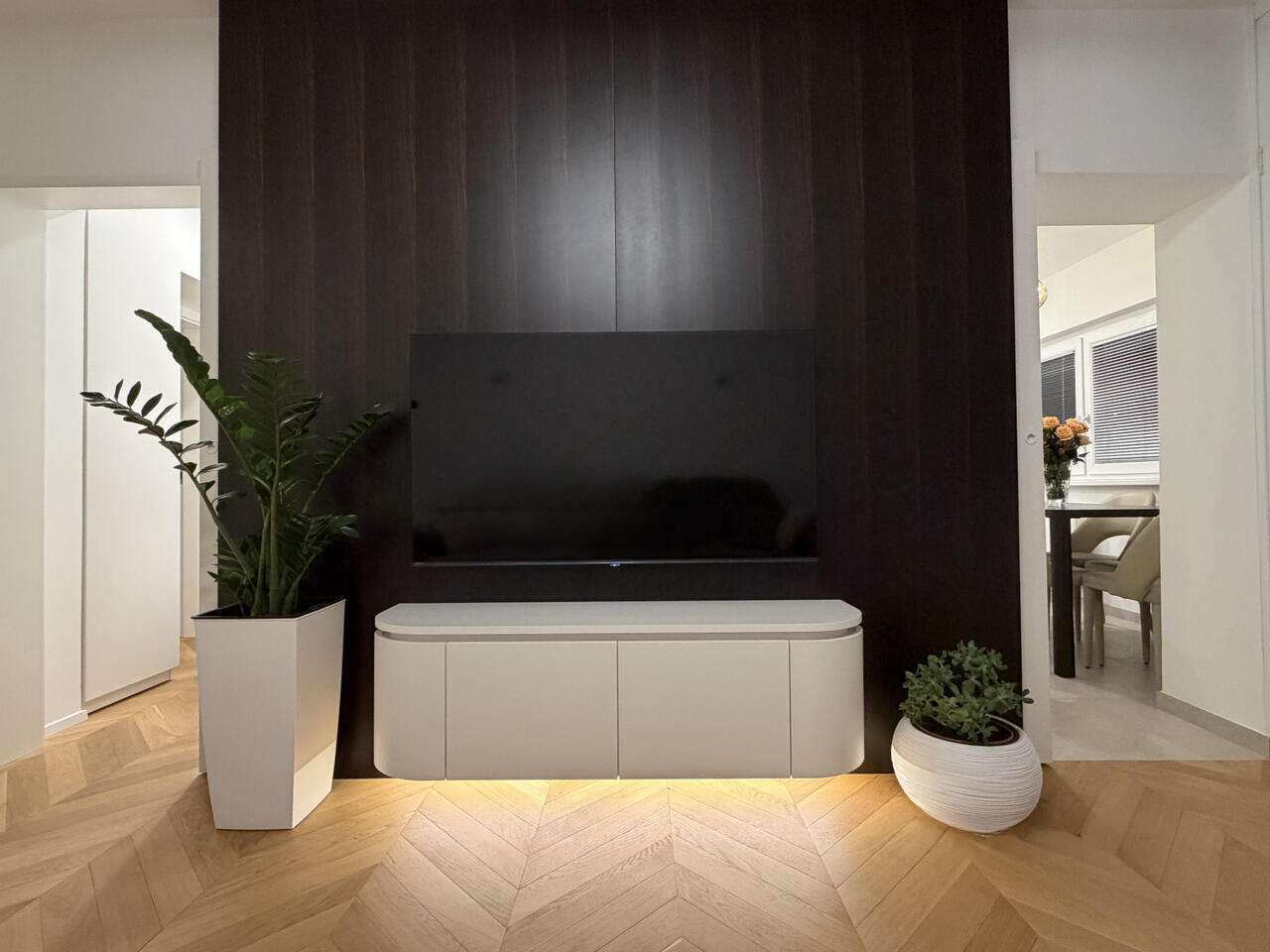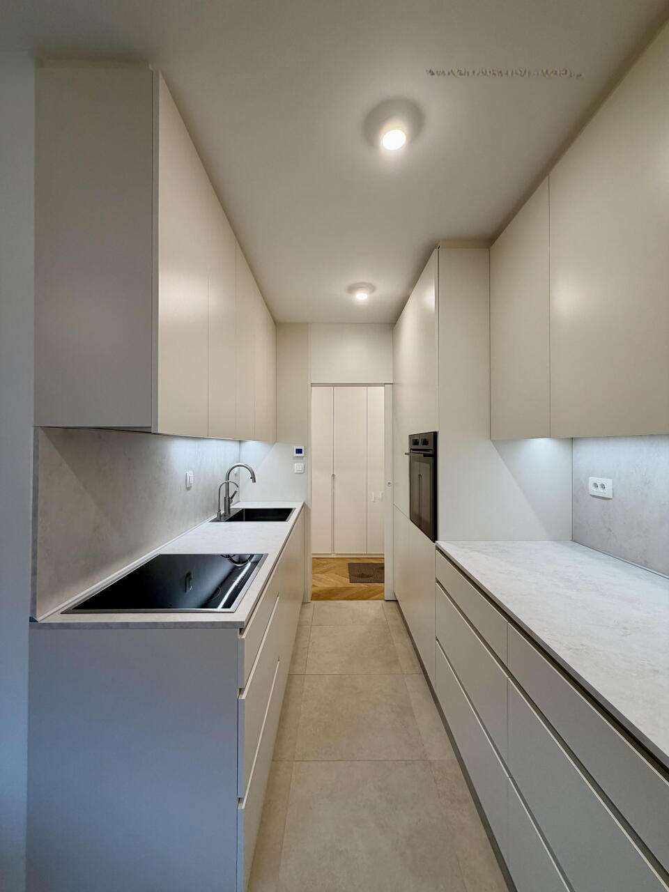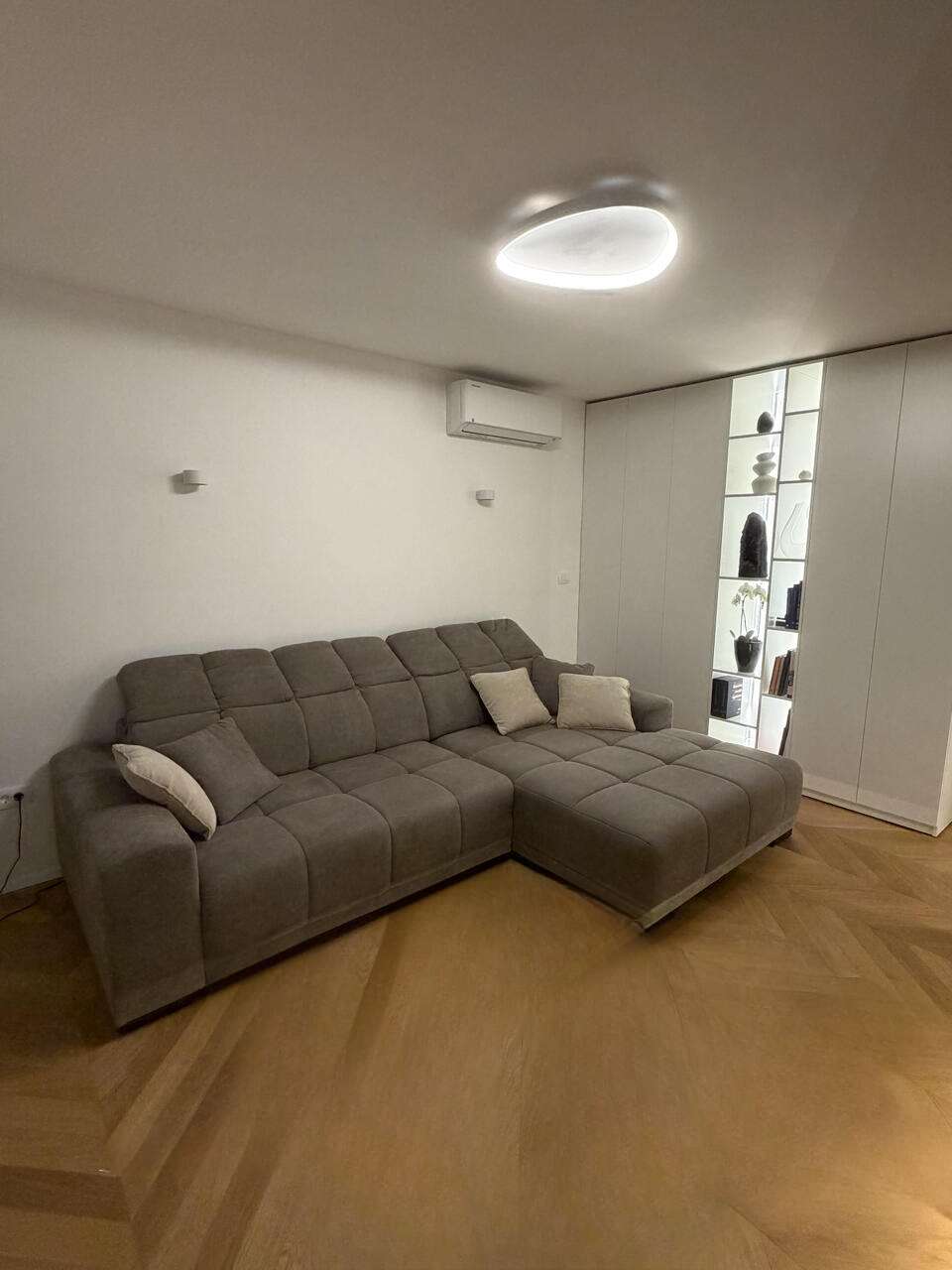 Кухня и гостиная обустроены с передовым оборудованием и высококлассной мебелью. В спальне установлена эффектная парящая двуспальная кровать, а также просторные гардеробы с LED-освещением. Детская комната может служить и кабинетом. В отделке использован масляный дубовый паркет в стиле «французская елочка» и итальянская керамическая плитка. Ванная комната отличается функциональностью и включает душевую и туалет.