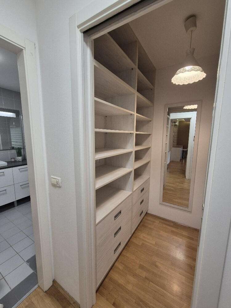 - Кладовые: 4 м² у входа в квартиру и гардеробная с встроенными шкафами для одежды.